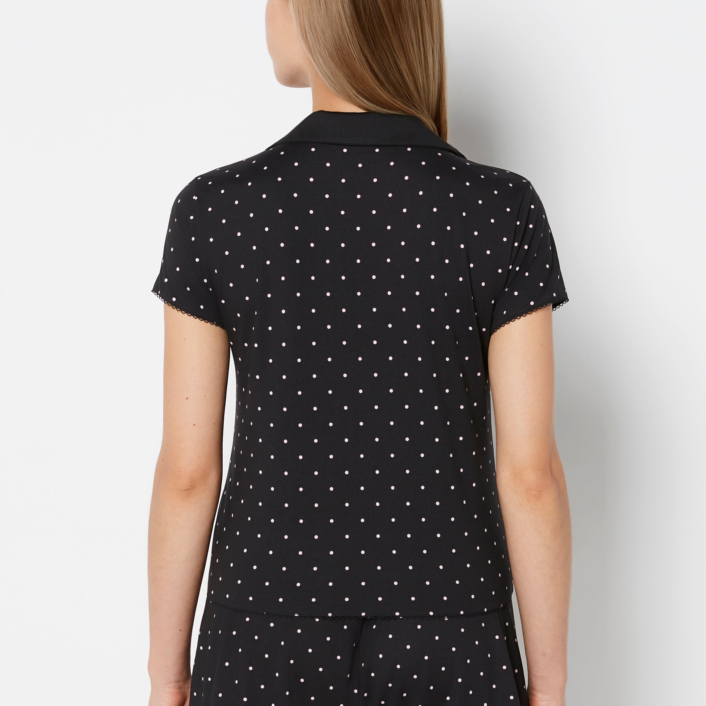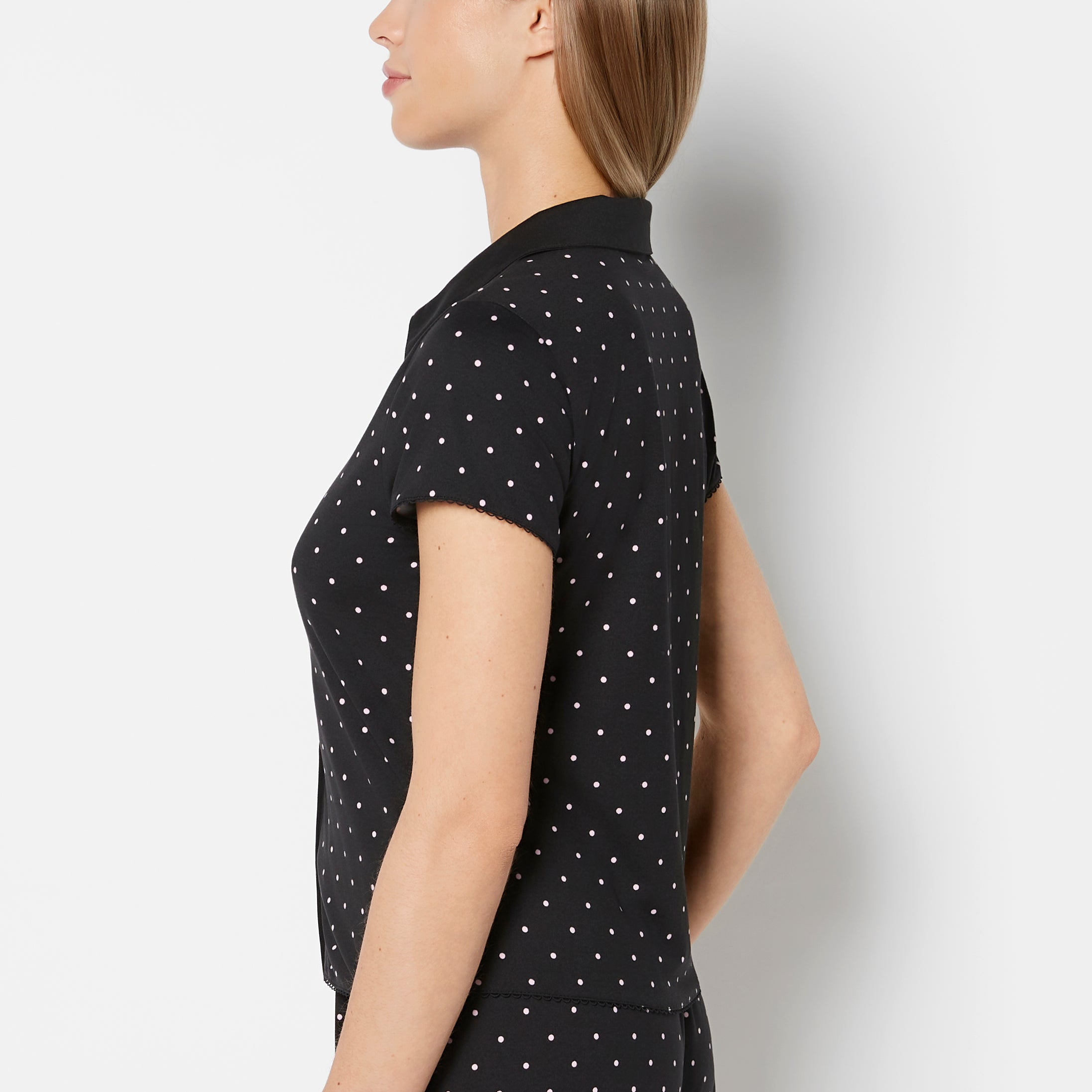 Casual Sleep Jersey Button Up Short Sleeve Top with Picot Trim in Tiny Dot